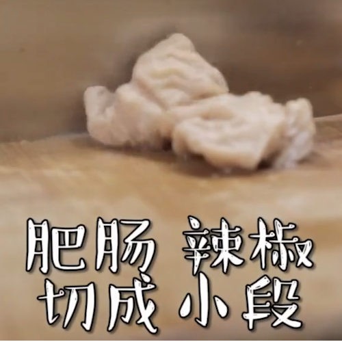 2、肥肠、辣椒切成小段。