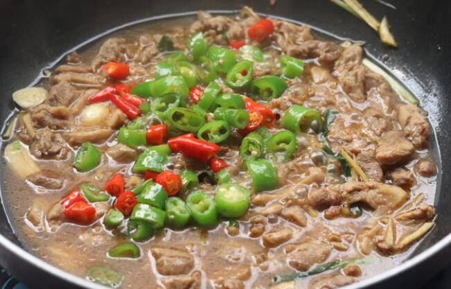 7、鸭肉焖煮的时间快到时,另外一口锅,放入少量的油,放入青红椒。