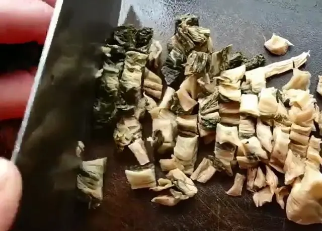 5、浸泡好的菜干冲洗干净,然后用刀切成小段。