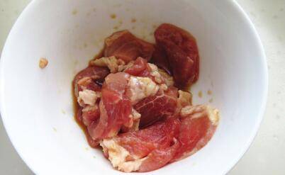 3、猪肉洗净切成薄片加入料酒、生抽和五香粉抓匀腌制一会儿。