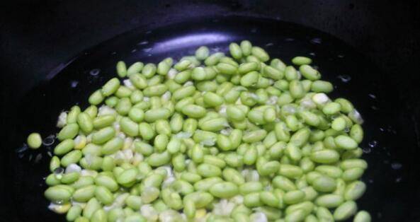 4、锅中倒入适量油,将过青豆和玉米粒放入其中,中火翻炒几下后加盐。