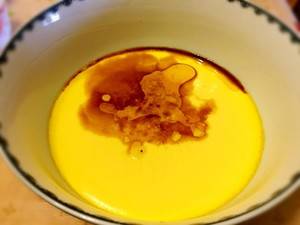 4、鸡蛋加水打匀之后,略微静置,用小勺将边缘的气泡舀走。