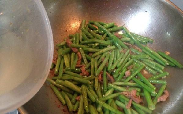 6、瘦肉炒至变色,下线豆。