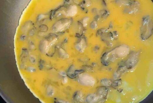 3、热锅冷油,倒入海蛎蛋液。