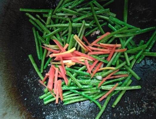 3、加入红萝卜炒熟放盐出锅。