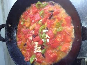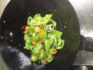 4、待油七八成热时,放入尖椒,干红辣椒。翻炒一两分钟。