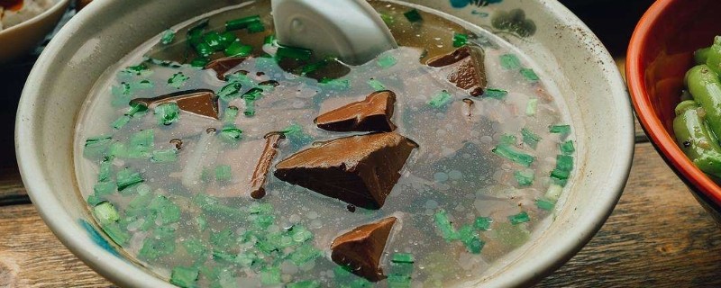 ||材料备好、姜蒜都切成沫了。葱切花。猪血洗净切片。坐锅烧油下姜蒜沫下去爆香。把猪血弄下去翻炒几下、颜色会变的有点黑。下自己需要的清水量。烧开、烧开后小火煮5分钟、下点盐适量、一点味精适量、然后撒葱花下去即可。