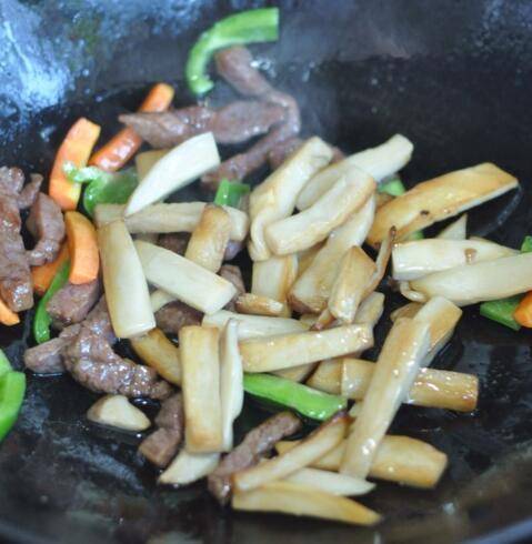准备材料:牛排60克、杏鲍菇100克、胡萝卜10克、青椒10克、油6克、盐2克、淀粉8克、蚝油6克。