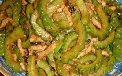 6、翻炒均匀,加点生抽;放入苦瓜和胡萝卜翻炒。
