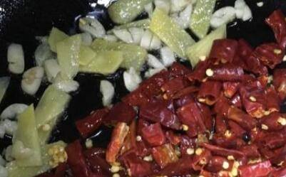 2、热锅下油,把干辣椒、姜、蒜末一并倒入锅内炒出香味。再倒入花椒子和大葱段翻炒。