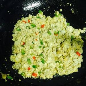 5、加入青红椒,翻炒均匀,可多炒一会,让青红椒炒熟。