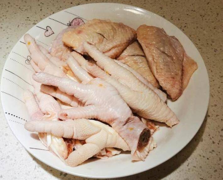 2、鸡翅、鸡爪清水浸泡半小时去除血水,鸡爪去脚趾对半切开、鸡翅两面划花刀。锅中注适量清水,倒入鸡翅鸡爪,加入姜片和1勺料酒,大火烧开,焯水2分钟。