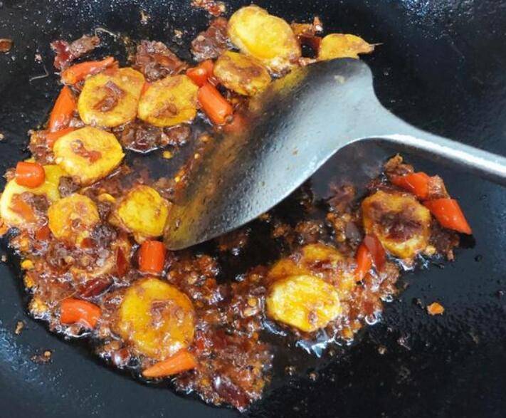 3、锅烧热倒入适量的食用油,下入切好的姜片炒香,这一步很关键,热油能把生姜的姜香味更好的炒出来,然后加入小米辣和1勺郫县豆瓣,炒出郫县豆瓣的红油即可。