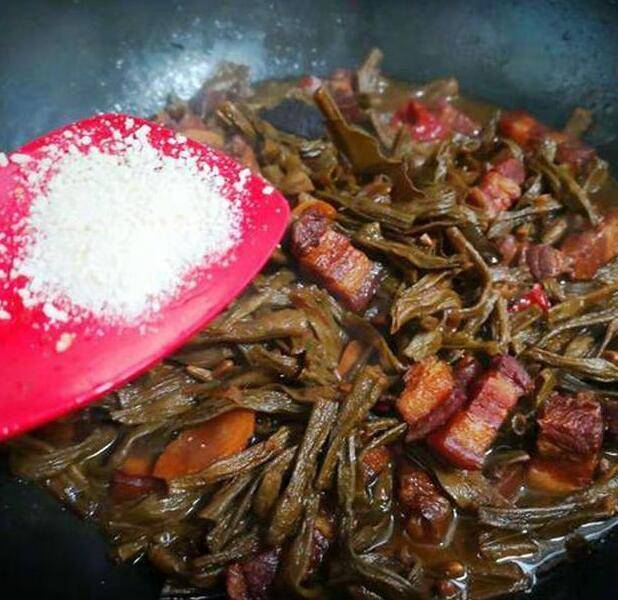 8、将豆角段放入,炒匀,继续炖约20分钟,中间翻炒几下,让豆角入味均匀,根据口味加适量盐即可。