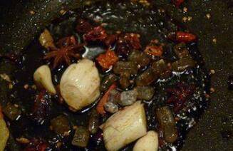 4、用锅中余下的少许油将葱、蒜、干红辣椒、大料、桂皮、香叶、丁香炒出香味。