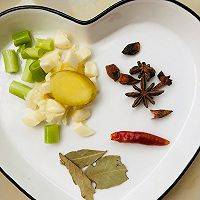7、准备汤汁佐料,起锅放1勺油葱、姜、蒜炝锅后放入八角和小辣椒,放入生抽加水、白糖、香叶、蚝油、八角。