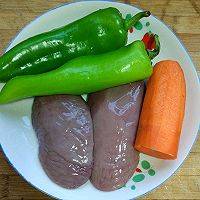 1、准备材料:猪腰子2个、尖椒2个、胡萝卜半根、大蒜一瓣、干辣椒5个、香葱2根、孜然5克、干辣椒5克、盐3克、味极鲜5毫升、味精2克、糖2克、油10毫升。