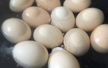 2、鸡蛋煮好后捞出,迅速用冷水冲泡,待鸡蛋降温后轻敲鸡蛋碎至蛋壳表面破碎,形成裂纹。