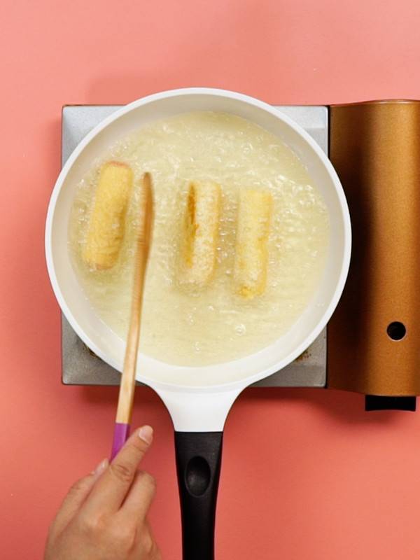 4、起锅倒油200毫升,放入芝士火腿,煎至两面金黄,放入盘中即可食用。