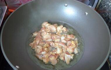 3、然后倒入腌制过的鸡丁滑炒一下,然后捞起沥干多余的油。
