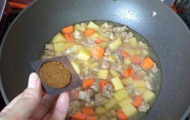 7、加入咖喱块、洋葱,大火至煮咖喱汁变浓稠。