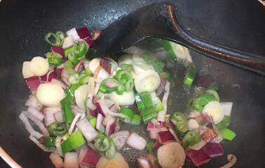 6、锅烧热,放入黄油融化,先后放入洋葱和大葱,炒2分钟左右爆香。