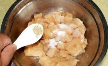 2、鸡脯肉丁里加盐、胡椒粉、料酒、水淀粉,抓匀,腌制10-20分钟。