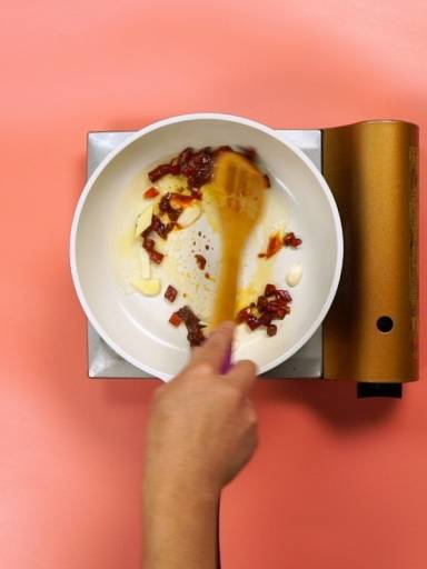 6、另起锅,倒入食用油5毫升、干辣椒、花椒,倒入蒜片、姜片、郫县豆瓣酱,大火爆香。