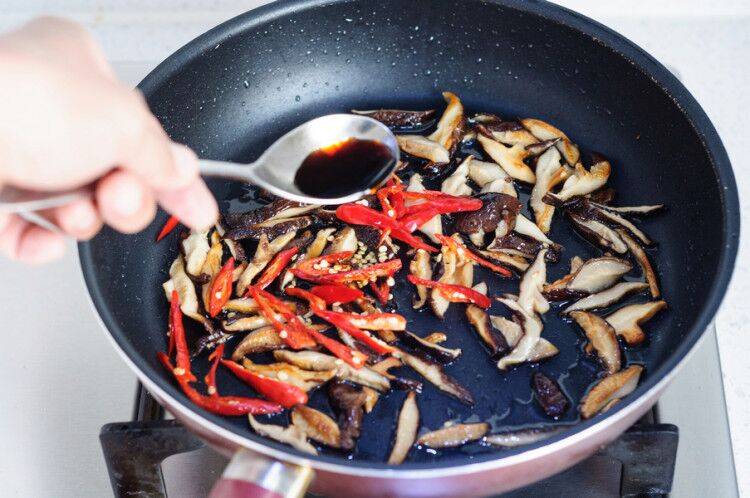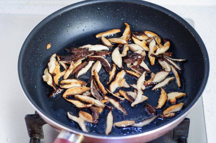 4、炒锅里倒入油,油热后放入香菇条煸炒至边缘微焦糊。