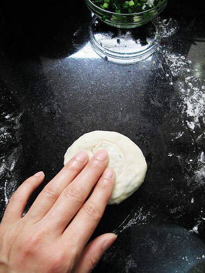 10、用手轻轻按一下面团,把面团慢慢压平,摊开。