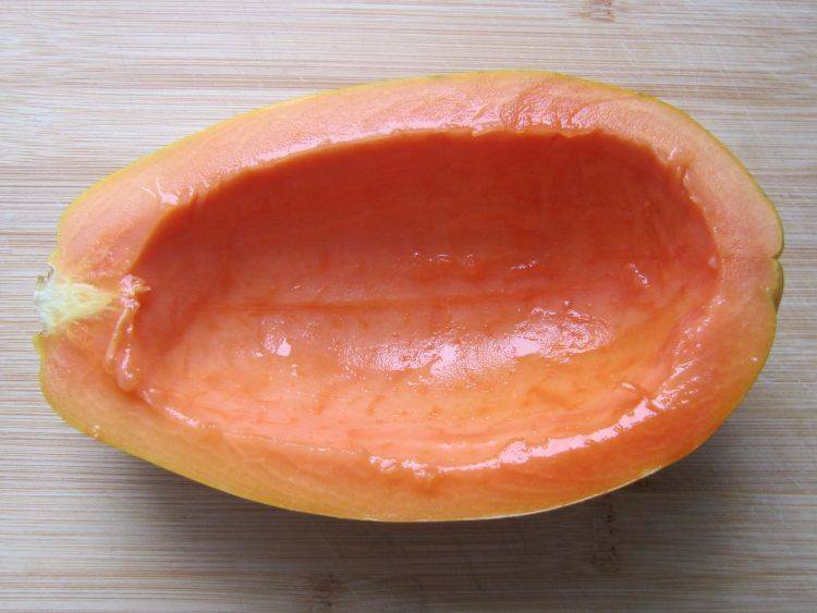 2、木瓜洗净,用勺子挖去籽和少量的果肉。