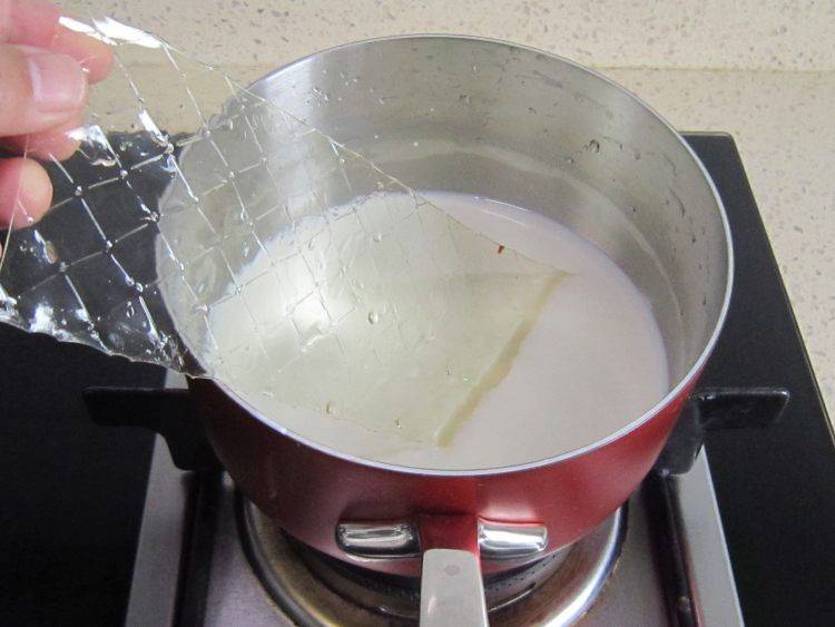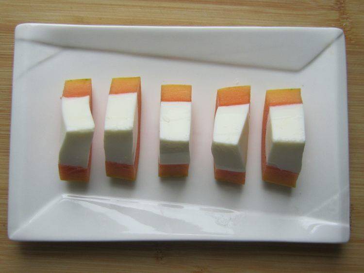 1、食材准备:木瓜半个、牛奶1盒、吉利丁片1片、砂糖适量。