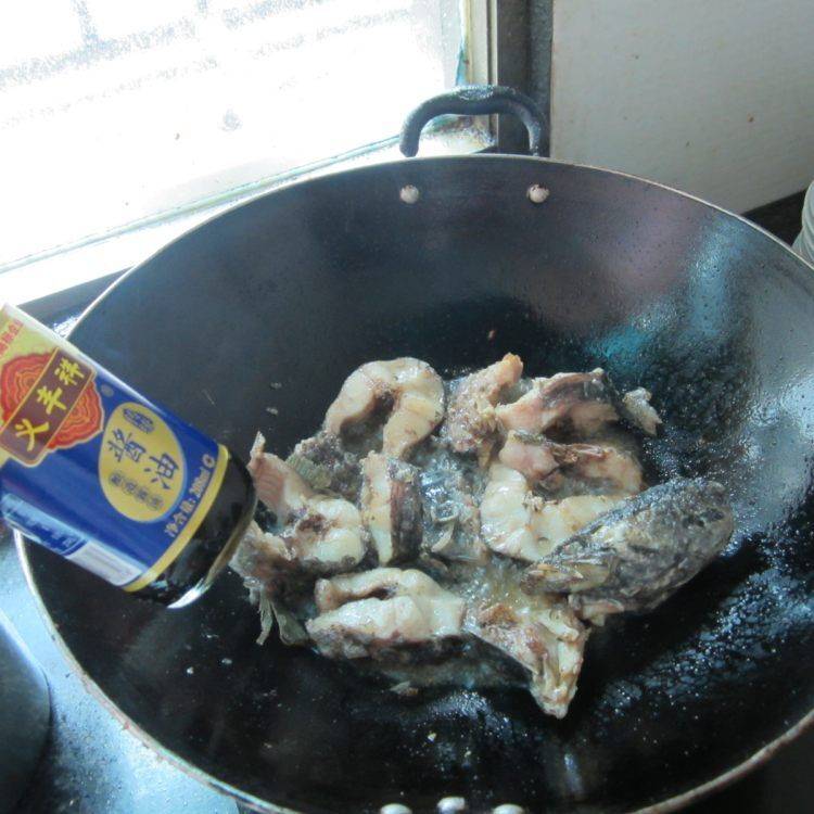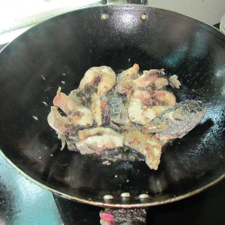 11、移锅边,放进辣椒,在辣椒上加点盐入味,如果鱼里盐够咸了就不用再加盐。