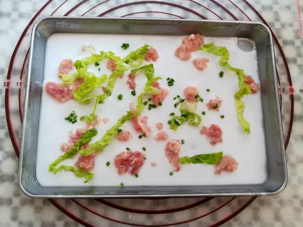 11、蒸到肠粉糊变白,猪肉变白即可出锅。