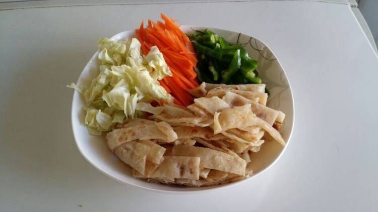 3、菜和饼切丝。