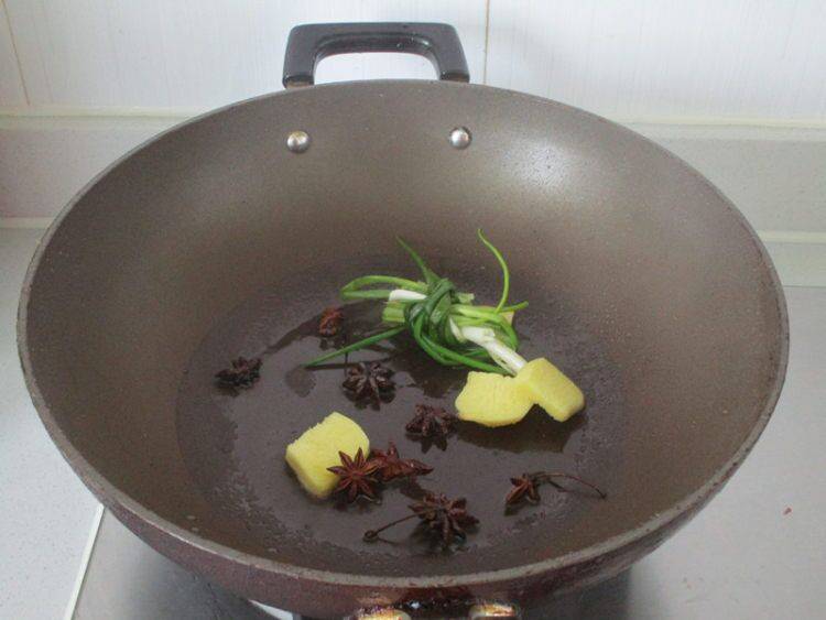 5、锅内倒入油,下入八角,生姜和小葱爆香。