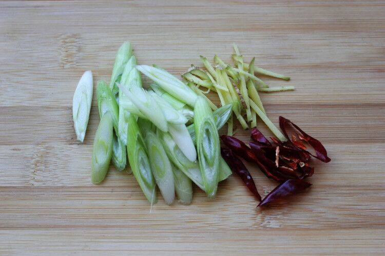 4、锅中放油,油热后,将辣椒和葱姜下锅爆香。