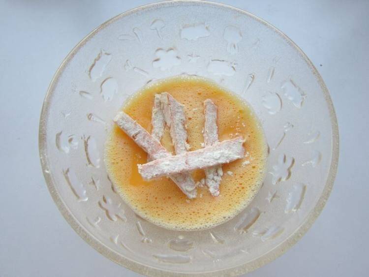 4、腌好的南瓜段会出水,控干水分后,放入干淀粉充分拌匀,使每一条上都沾有淀粉。