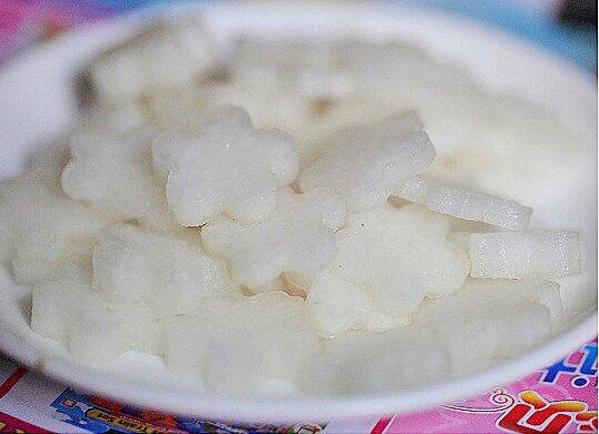 3、白萝卜去皮后切片,用蔬菜摸切出花样。