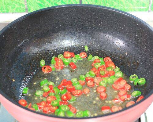 9、锅内留少许底油,煸炒葱、姜、蒜及青红椒、泡辣椒。