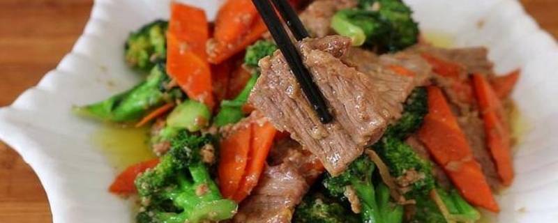 5、另外起锅烧油,锅内油热之后放入提前切好的葱姜丝爆香,炒出香味之后放入焯过水的西兰花和胡萝卜片,翻炒一分钟之后,倒入牛肉,继续翻炒,加入生抽,食用盐和蚝油,翻炒均匀之后就可以出锅装盘了。