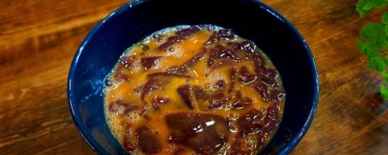 3、准备适量的水淀粉,切好的猪肝片放入一个深碗里,加入一勺料酒,一个鸡蛋,适量水淀粉一勺,搅拌均匀腌制一会儿。