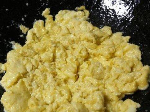 4、蛋液膨胀后翻面,用锅铲炒散。
