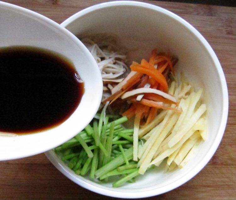 1、食材准备:金针菇100克、芦蒿100可、黑大豆干50克、胡萝卜50克、冬笋50克、干辣椒、盐、醋、生抽、白糖、花椒、蒜片各适量。