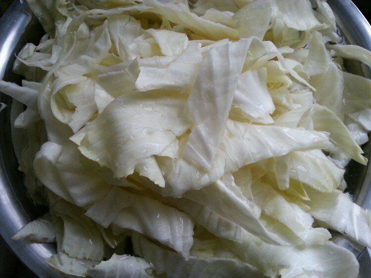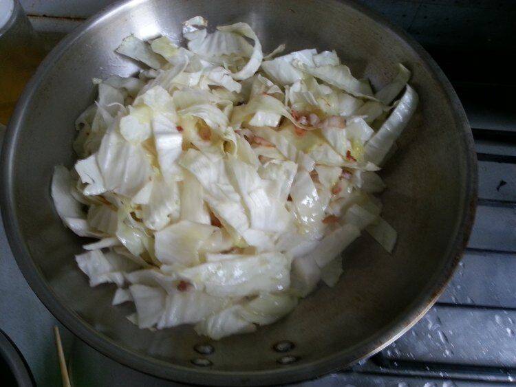 6、下入葱姜和辣椒炒香,倒入圆白菜翻炒。