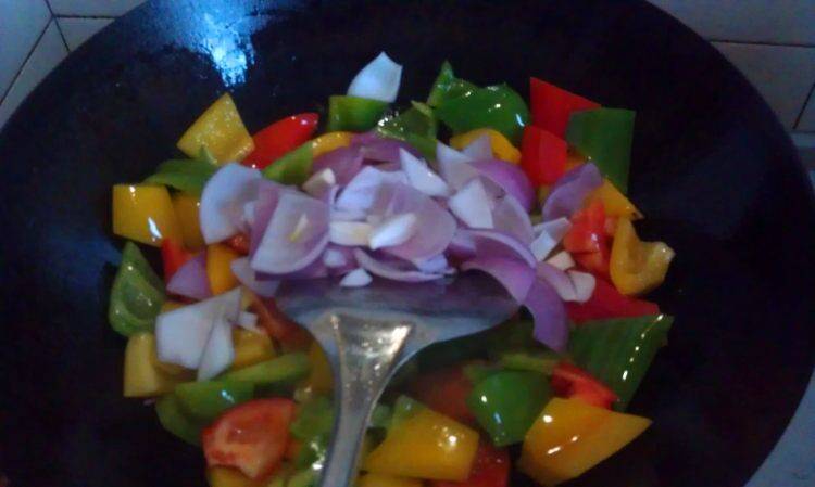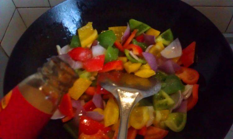 4、锅内烧热油,后把彩椒放入翻炒至断生。