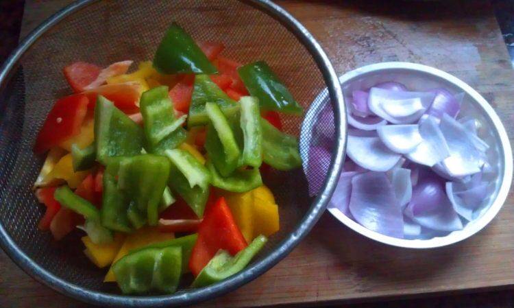3、彩椒与洋葱切滚刀片。