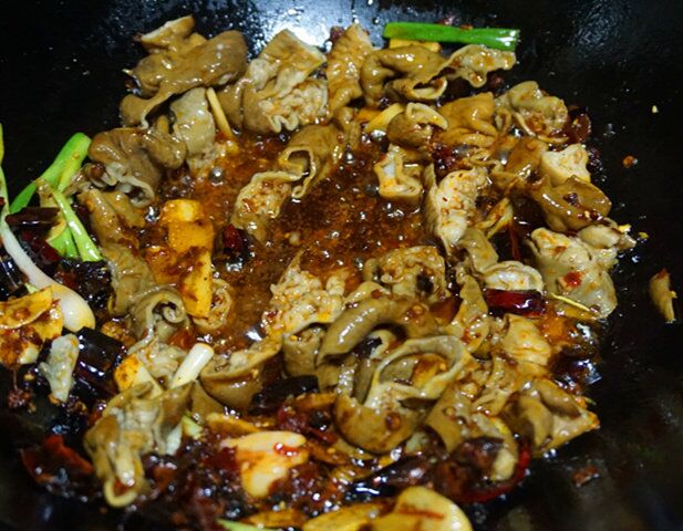 4、下入肥肠大火翻炒1~2分钟,然后下入青辣椒翻炒均匀。