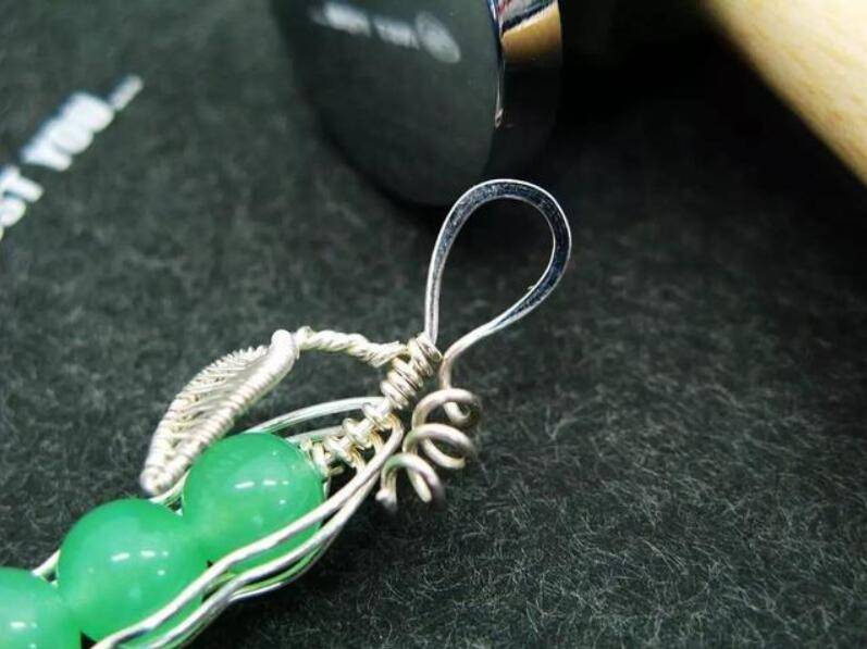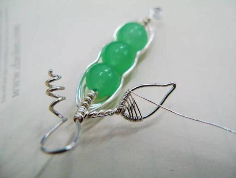 7、缠绕之后把最先开始的起始头作为豆荚的柄那一端,光滑的作为尾部。外框银线在豆荚柄部收紧,并作出一片小叶子的造型。